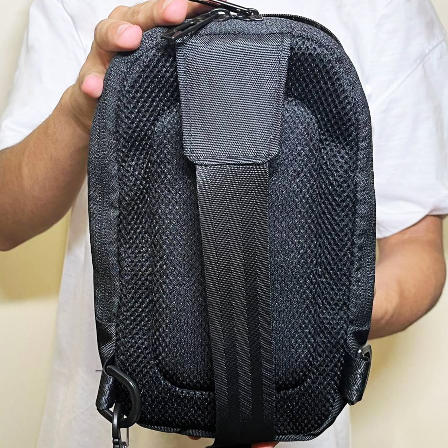در پشت کیف، بند شانهای با طراحی مشبک و پددار قرار دارد که باعث تهویه هوا و راحتی بیشتر در استفاده طولانیمدت میشود. این بند همچنین قابل تنظیم است، زیرا کیف را میتوان بهصورت کراسبادی یا دوشی متناسب با ترجیح کاربر حمل کرد